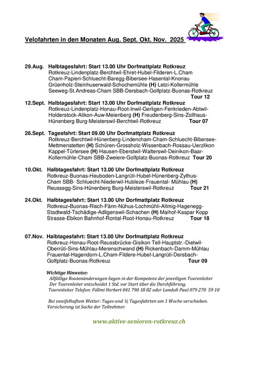 Von März bis November unternimmt unsere Velogruppe jeden zweiten Freitag eine Halbtages Velotour von ca. 40 km im Kanton Zug und den angrenzenden Gegenden. Es wird nur bei gutem